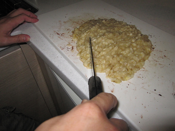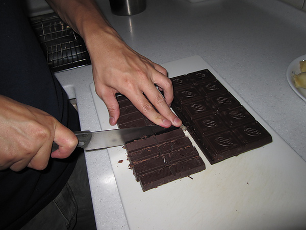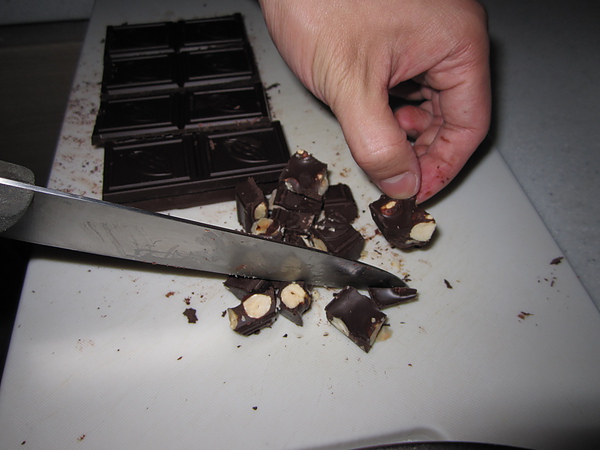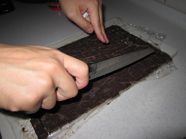 9. 自冷凍庫取出後,先將刀子沾過熱水。並將巧克力切成小塊狀。