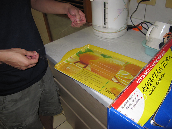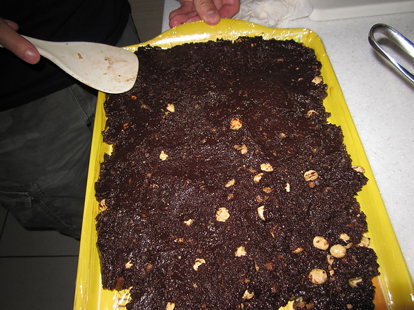 7. 準備一平盤並鋪上一層保鮮膜,完成後將混合均勻的原料到入盤中且整平。
