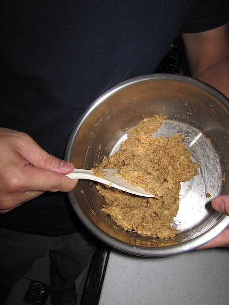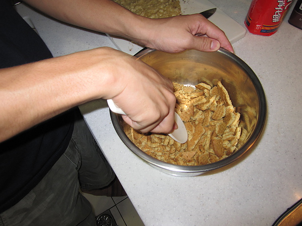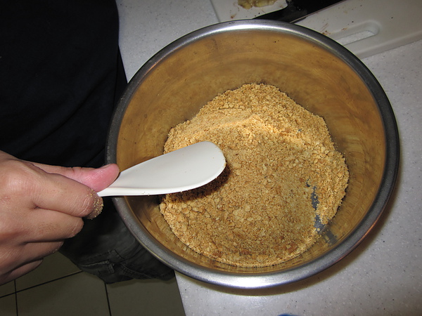4. 等待的過程中可先將香蕉泥和成碎狀的消化餅混合拌勻