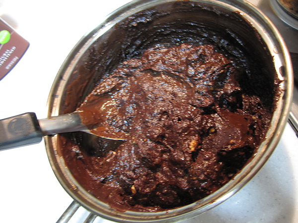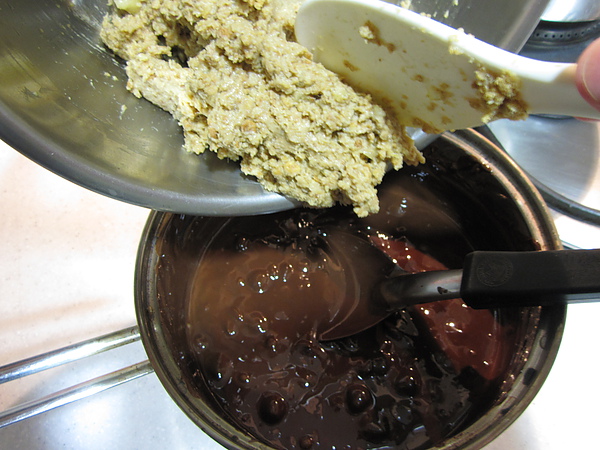 6. 待巧克力融解後,即可將拌勻的香蕉泥餅乾拌入攪勻。