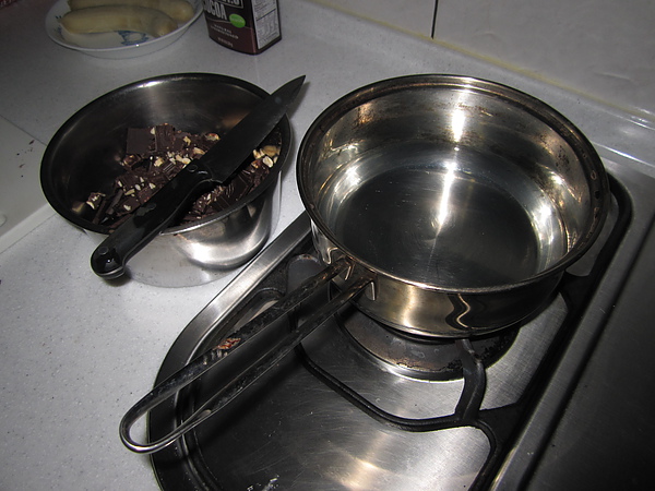 3. 準備兩個大小不同的鍋子,小鍋子加水1/3後加熱。準備融化巧克力