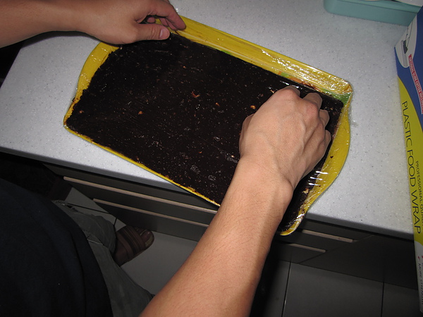8. 整平後再覆蓋上一層保鮮膜,並放入冰箱冷凍庫中冷凍約30分鐘。
