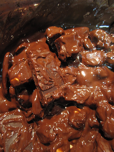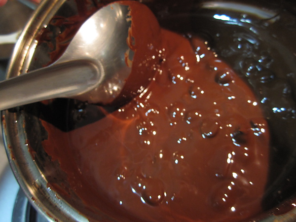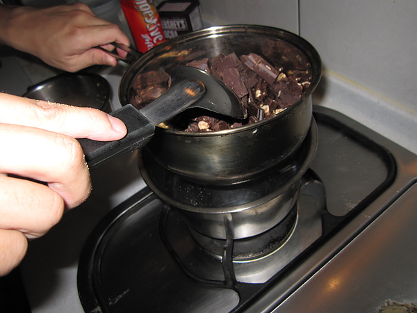 5. 小鍋子中的水不用煮沸,維持高溫即可。將切成小塊的巧克力放置大鍋中,利用隔水加熱的方式慢慢融化巧克力。