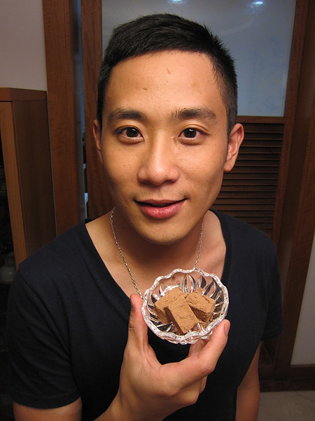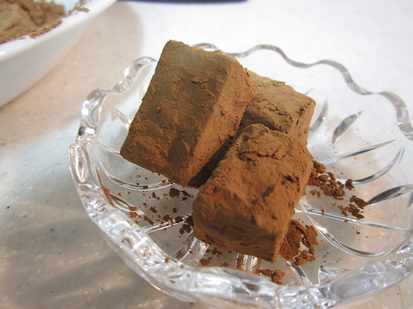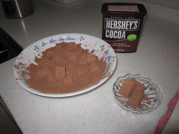 10. 取一較大口面的平盤,倒入準備好的即融巧克力粉。將切成小塊的巧克力放入,每一面都平逡的沾上一層巧克力粉即完成。