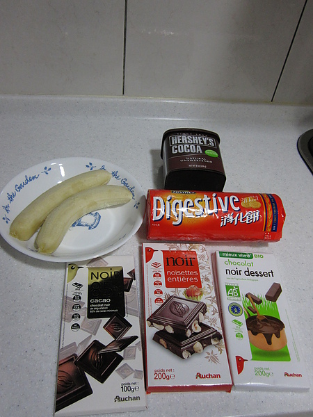 材料:巧克力 300~400g、香蕉 2~3條、消化餅 1包、即融巧克力粉些許