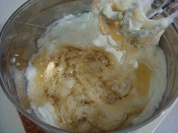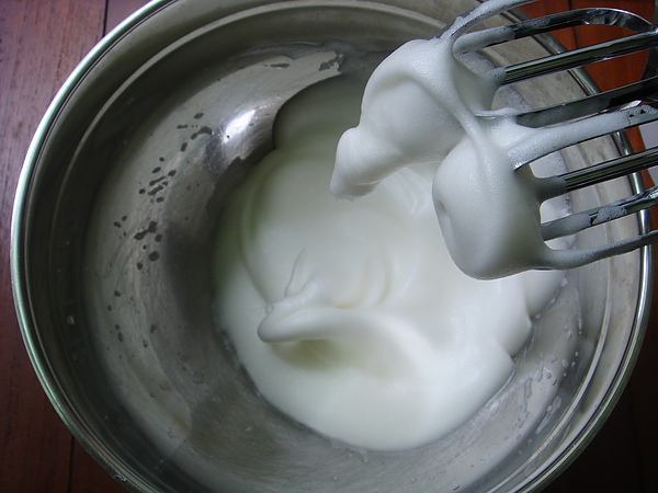 3.將蛋白打發,然後加入做法2的糖漿,繼續攪拌均勻