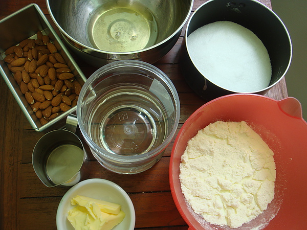 材料:a.杏仁300g 蔓越莓250g ,b.水1/2杯、細砂糖400g、麥芽糖500g;c.蛋白2個、奶粉80g、奶油30g