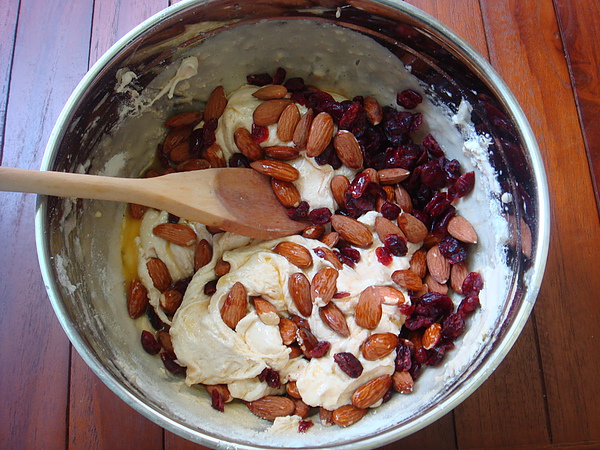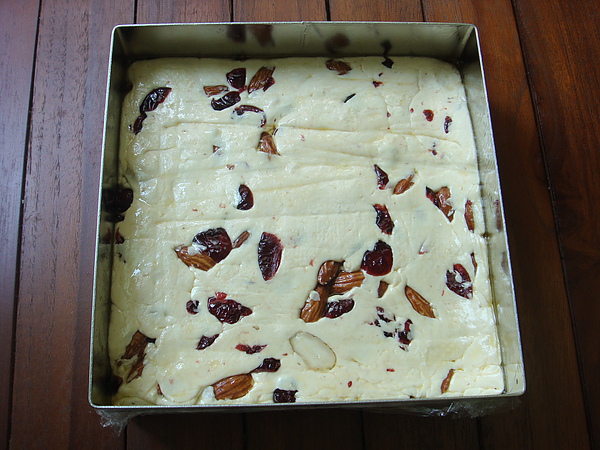 4.將奶粉加入做法3中待混合均勻後,加入奶油、杏仁及蔓越莓,再倒入模型中放冷即可切塊,切塊時先把刀子抹油會比較好切