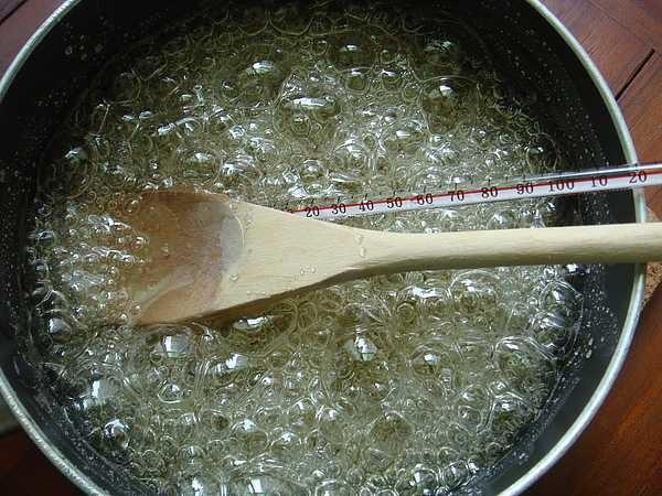 2.將材料b放入鍋中以中火熬煮糖漿,煮到130度‧如果沒有烘焙用的溫度計,可將糖漿低在冰塊上看能否結成塊,若可以就表示煮好了